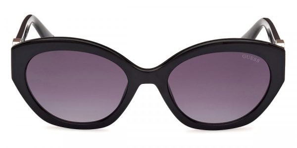 Guess GU00104 01B 56 sunglasses in Shiny Black. The 01B Shiny Black color frame is complimented with Gradient Smoke finish lenses. This model features Injected Oval Shape in size 56-19-140.